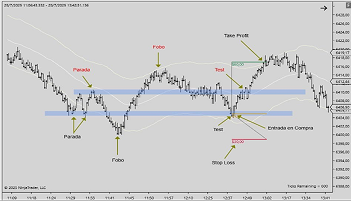 El test es la fase final y el punto óptimo de entrada. Después del Fobo, el precio regresa al rango y eventualmente vuelve a probar la zona donde ocurrió la falsa ruptura.