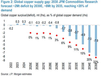1. «Brecha de suministro mundial de cobre: pronóstico de JPM Commodities Research para 2030: ~2 Mt de déficit para 2030E, ~8 Mt para 2035, alcanzando >20% de la demanda”